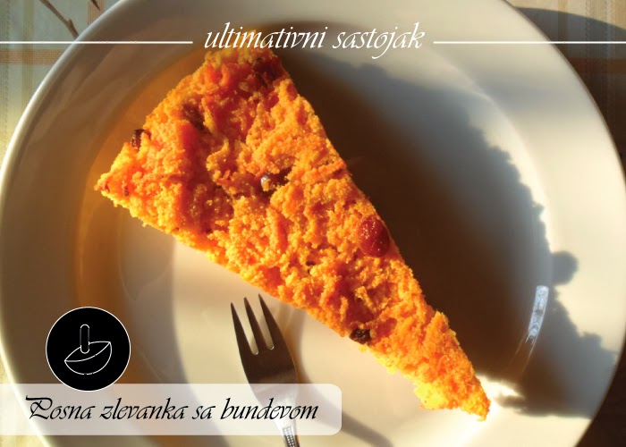 Pomešati rendanu bundevu sa šećerom i vanil šećerom i ostaviti desetak minuta da bundeva pusti svoj sok. Dodati kukuruzno brašno , ulje , limunov sok, suvo groždje i brusnice i rukama sve dobro sjediniti tako da se kukuruzno brašno rasporedi po rendanoj bundevi.